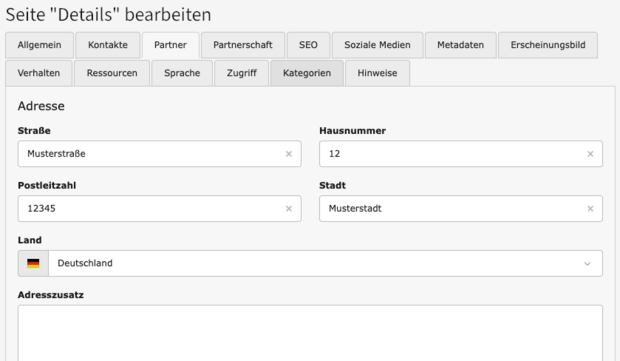 Im Reiter “Kategorien” lassen sich dem Partner Kategorien zuordnen, die für den Redakteur im Backend sichtbar sind.
