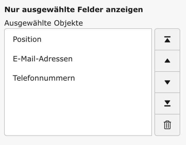 Durch den Reiter “Nur ausgewählte Felder anzeigen” kann begrenzt werden, welche Informationen zum jeweiligen Objekt angezeigt werden. In dem folgenden Beispiel werden z.B. nur Position, E-Mail-Adressen und Telefonnummern angezeigt.
